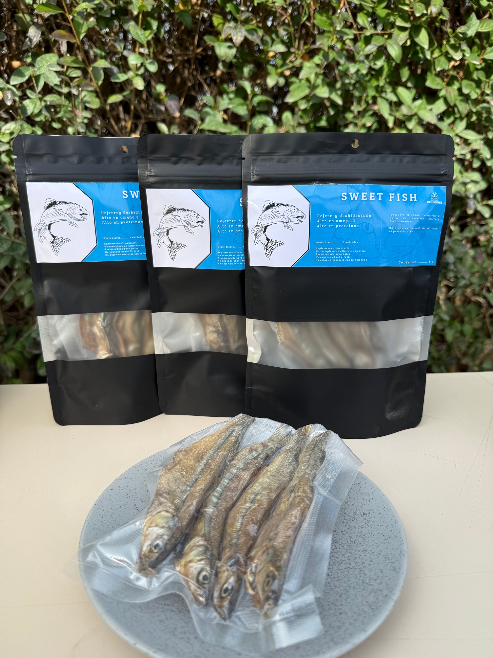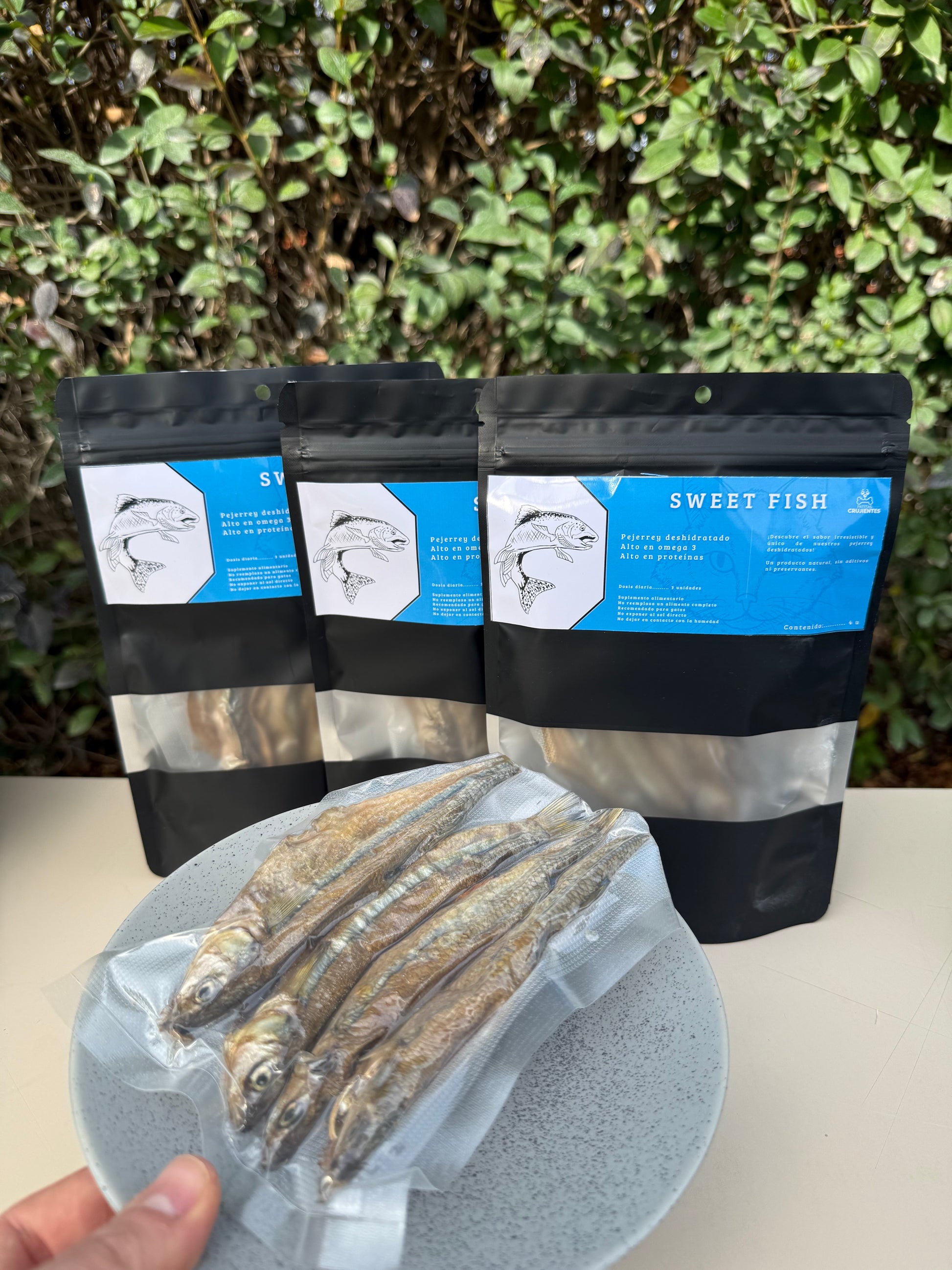 Incluye 3 pejerrey deshidratados, un snack crujiente, sabroso y completamente natural que tu michi adorará.